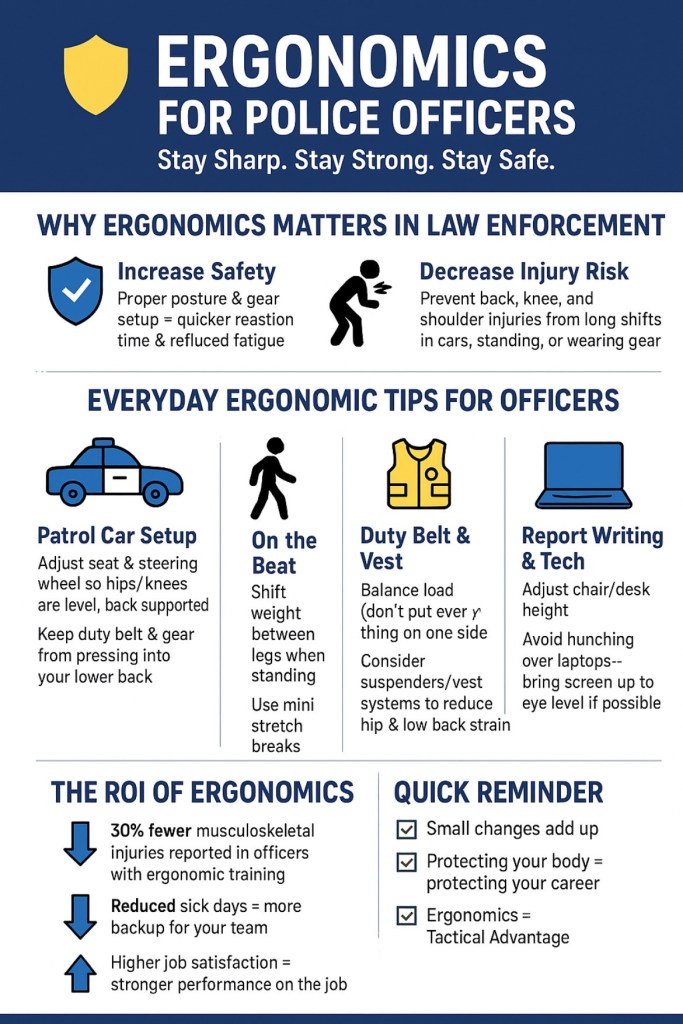 We know our First responders, do a lot of work training in person. We at ErGO believe that ergonomic safety is much more than a 10 minute video to complete during onboarding. Ergonomics and proper movement can help protect our first responders. Our goal is to extend the longevity of their careers, improve their mechanics, and ultimately increase their safety.